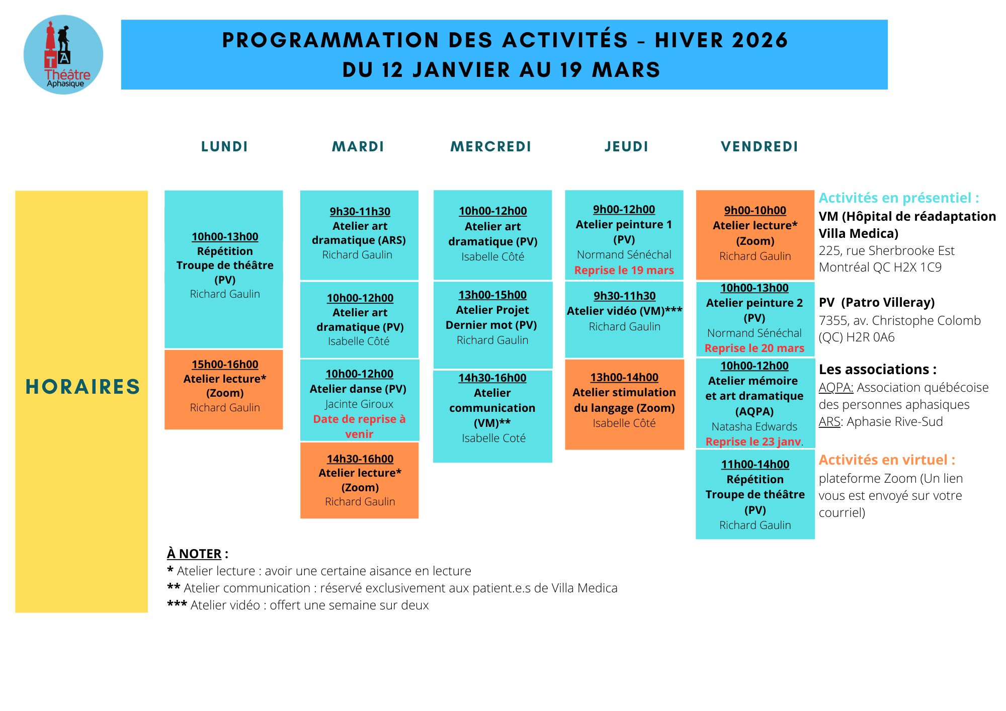 Le Théâtre Aphasique propose aux personnes aphasiques, qu'elles soient en réadaptation active ou non, des activités artistiques en théâtre, peinture, et danse. Ces ateliers visent à les aider à préserver leurs acquis, à se réadapter, et à rompre l'isolement par la socialisation.